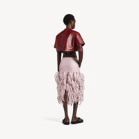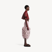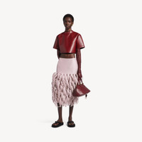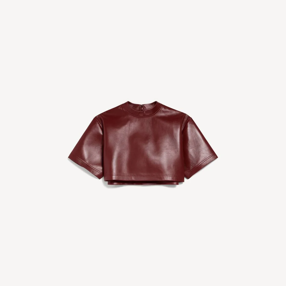 Cropped T-Shirt in burgundy double shiny lambskin is from look 13 of Balenciaga's Summer 26 Collection. PRODUCT DETAILS • Double shiny lambskin • Cropped design • Volume at the back for added structure • Crewneck • Wide short sleeves • Debossed Balenciaga logo on the left sleeve • Made in Italy Main material: Lambskin