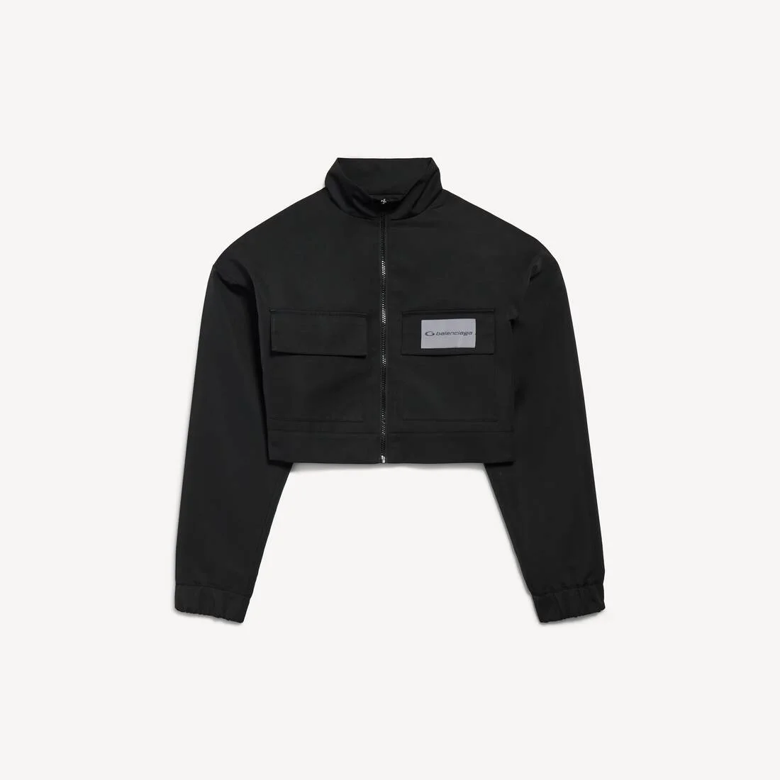 Cropped Tracksuit Jacket in black technical faille PRODUCT DETAILS • Technical faille • Cropped tracksuit jacket • High collar • Front zip closure • 2 front flap pockets • Grey Balenciaga patch on left pocket • Elasticated cuffs • Made in Italy Main material: 100% polyester