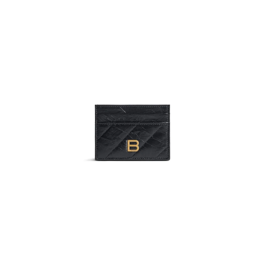Crush Card Holder in black crushed calfskin and quilted PRODUCT DETAILS • Dimensions: L3,9 x H2,9 x W0,2 inch • Crushed calfskin and quilted • Card holder • Aged-gold B logo hardware • 4 card slots • 1 bill pocket • Made in Italy • Wipe with a soft cloth Material: 100% calfskin