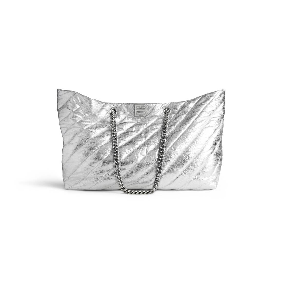 Crush Large Carry All Tote Bag Quilted in silver metallized crushed calfskin, aged-silver hardware PRODUCT DETAILS • Dimensions: L22,8 x H12,2 x W7,1 inch • Handle drop: 9,2 inch • Metallized crushed calfskin and quilted • Carry all tote bag • Two chain handles • Aged-silver B logo hardware • Turn lock closure • 1 inner zipped pocket • Cotton canvas lining • Made in Italy • Wipe with a soft cloth Material: 100% calfskin