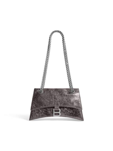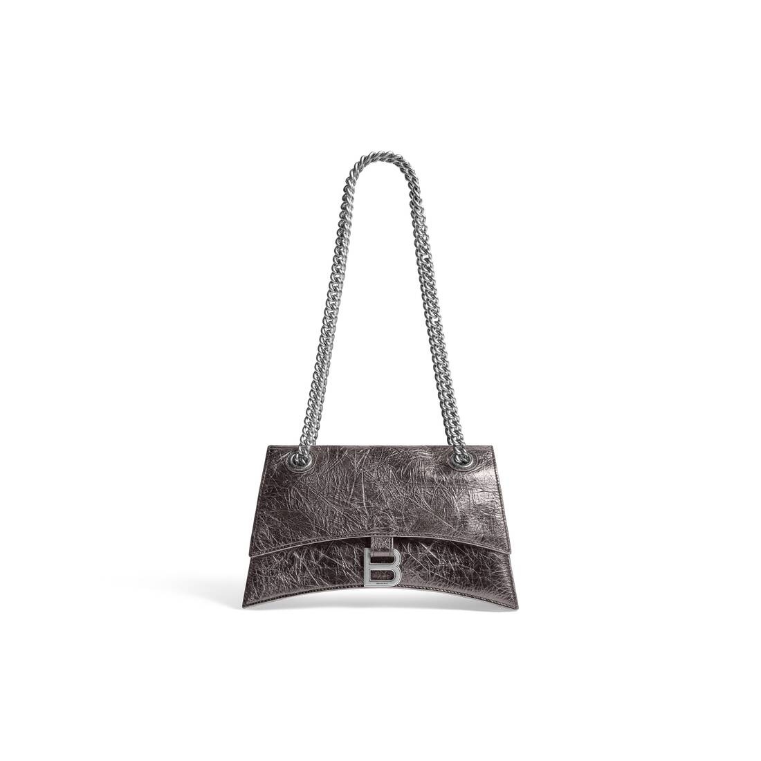Crush Small Chain Bag in dark grey metallized crushed calfskin, aged-silver hardware PRODUCT DETAILS • Dimensions: L9,8 x H5,9 x W3,1 inch • Metallized crushed calfskin • Chain bag • Curvilinear base • Shoulder and crossbody chain strap (19,6 inch) • Aged-silver B logo hardware • Studded magnet closure • 3 compartments • 1 inner zipped pocket • 1 inner flat pocket • Nappa lambskin lining • Made in Italy • Wipe with a soft cloth Material: 100% calfskin