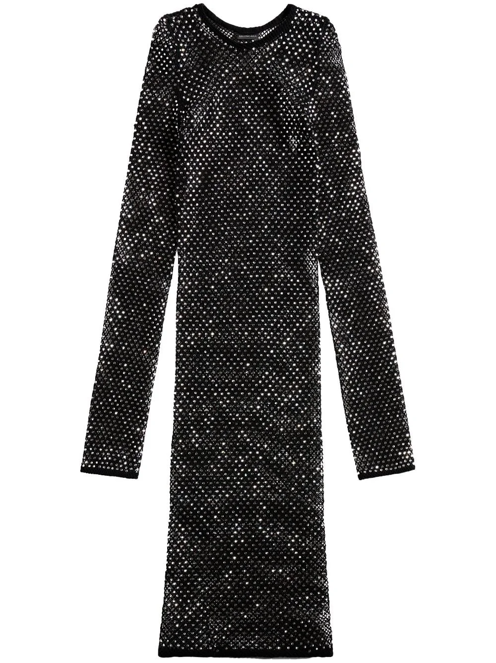 crystal-mesh long-sleeve minidress The crochet-knit construction of this long-sleeve minidress is adorned with glistening rhinestones for an opulent look — a nod to Balenciaga's experimental approach to proportions and texture. Highlights - Black - Crochet knit - Rhinestone embellishment - Round neck - Long sleeves - Thigh-length - Stretch-design Made in Italy Composition Polyamide 80%, Spandex/Elastane 20%