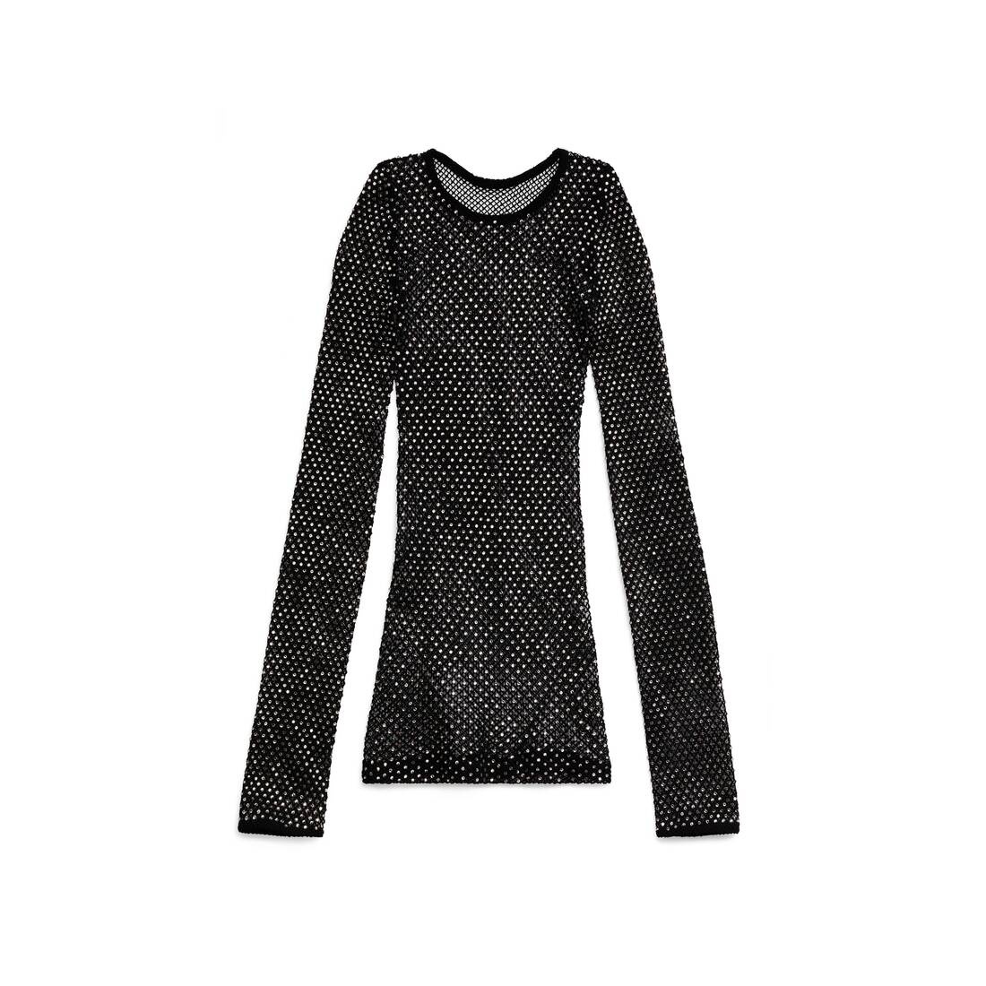 Crystal Mesh Top in black and silver crochet with rhinestones is from the look 30 of the Balenciaga's Summer 23 Collection. PRODUCT DETAILS • Mesh crochet with rhinestones • This item is unisex • Bodycon fit • Transparent fabric • Crewneck • Long sleeves • Made in Italy • Dry cleaning • The model is wearing a size S Material: 80% polyamide, 20% elastane