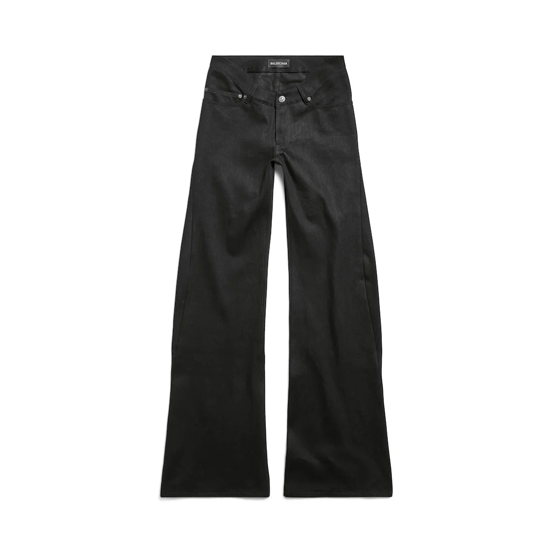 Curved Waist Pants in black cotton denim for Women PRODUCT DETAILS • Cotton denim • Curved waistline • Covered button fly • 5 belt loops • 5 pockets • Balenciaga engraved flex buttons • Balenciaga Jeans jacron at back • Made in Italy Main material: 100% cotton