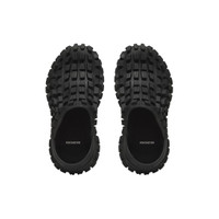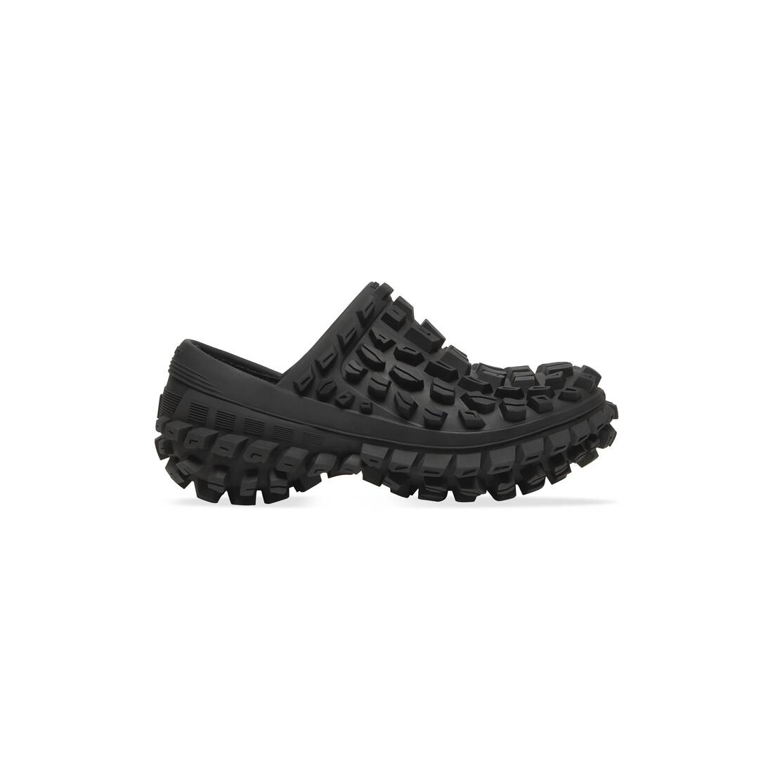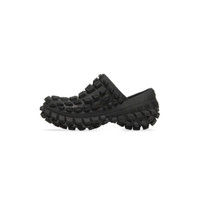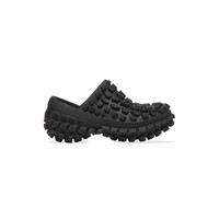 Defender Clog in black rubber PRODUCT DETAILS • Rubber • Clog • Slip-on • 20mm arch • Extreme tire tread sole • Balenciaga logo debossed at the edge of the toe, at back and on the upper • Written size on the upper and at the back of the heel • Made in China • Wipe with a soft cloth Material: 100% rubber