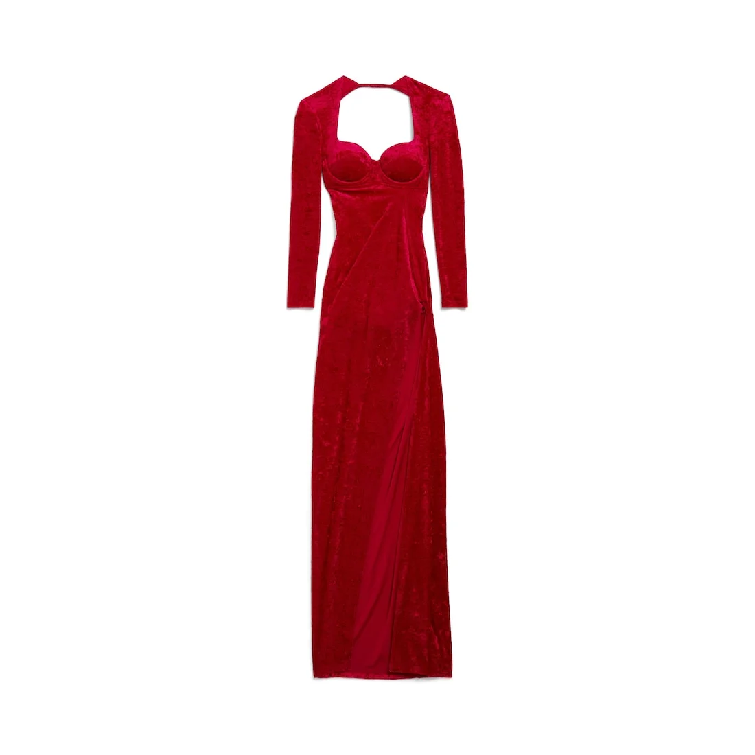 Draped Maxi Dress in garnet crushed velvet jersey PRODUCT DETAILS • Draped • Swimsuit inspired • Large decollete with breast cups, armatures • Long sleeves • Open back with • Iner body • Left front slit • Made in Italy Main material: 85% polyamide, 15% elastane
