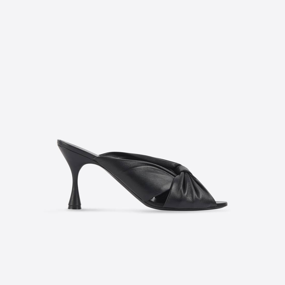 Drapy 80mm Mule in black smooth nappa lambskin PRODUCT DETAILS • Smooth nappa lambskin • Mule • Open rounded toe • Trumpet heel • 80mm arch • Black sole and insole • Tone-on-tone covered heel • Made in Italy • Wipe with a soft cloth Material: 100% lambskin