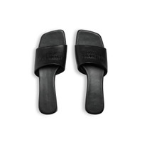 Duty Free Flat Sandal in black shiny soft lambskin PRODUCT DETAILS • Shiny soft lambskin • Flat sandal • Square toe • 10mm arch • High frequency embossed Balenciaga Paris logo on the upper • Tone-on-tone covered heel • Black sole • Made in Italy • Wipe with a soft cloth Material: 100% lambskin