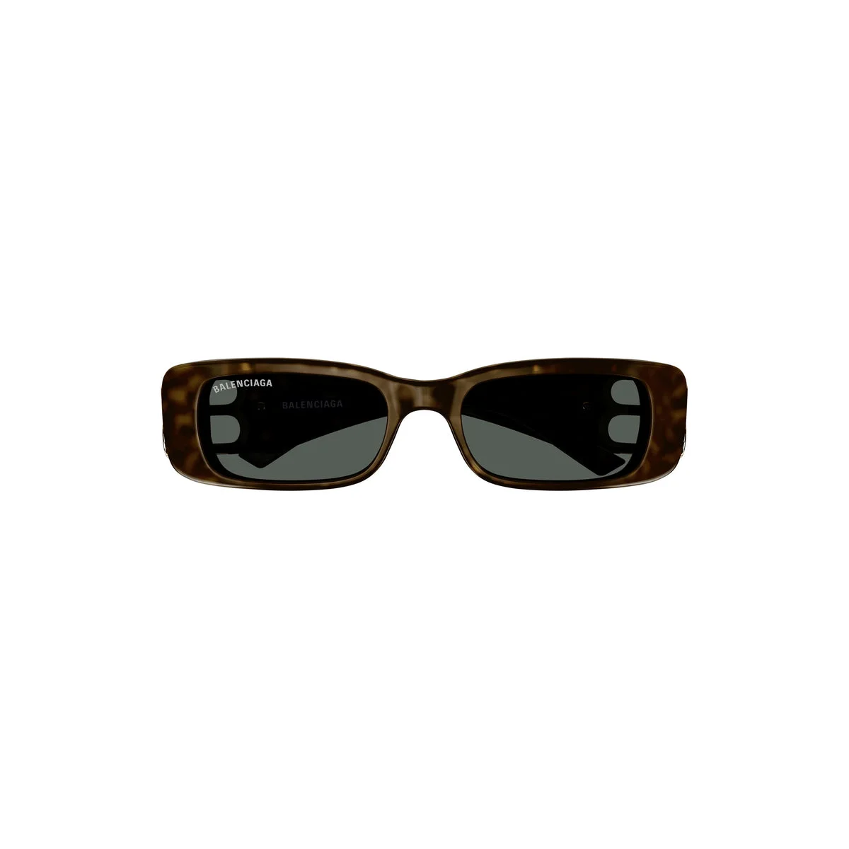 The BALENCIAGA Dynasty Rectangle Sunglasses have a bold rectangular shape and a sleek havana and gold acetate frame. They offer a modern take on classic luxury, with grey lenses that provide a sharp contrast and ensure everyday UV protection. Crafted expertly in Italy, they reflect Balenciaga's commitment to refined aesthetics and premium quality. Lens Width: 51mm. Material: 100% Acetate Color: Havana/Gold Made in Italy Sku: BB0096S/002