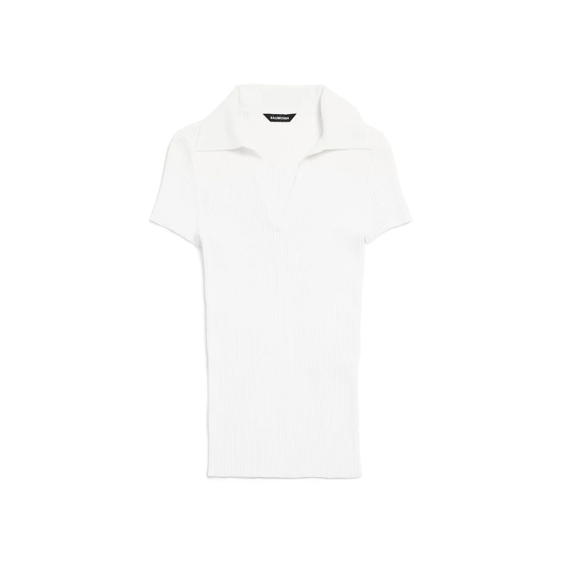 Fitted Polo Top in white classic knit wool PRODUCT DETAILS • Classic rib knit • Polo collar • V-neck • Short sleeves • Ribbed finishing • Balenciaga logo embroidered at back collar • Made in Italy Main material: 90% wool, 8% polyamide, 2% elastane