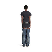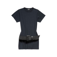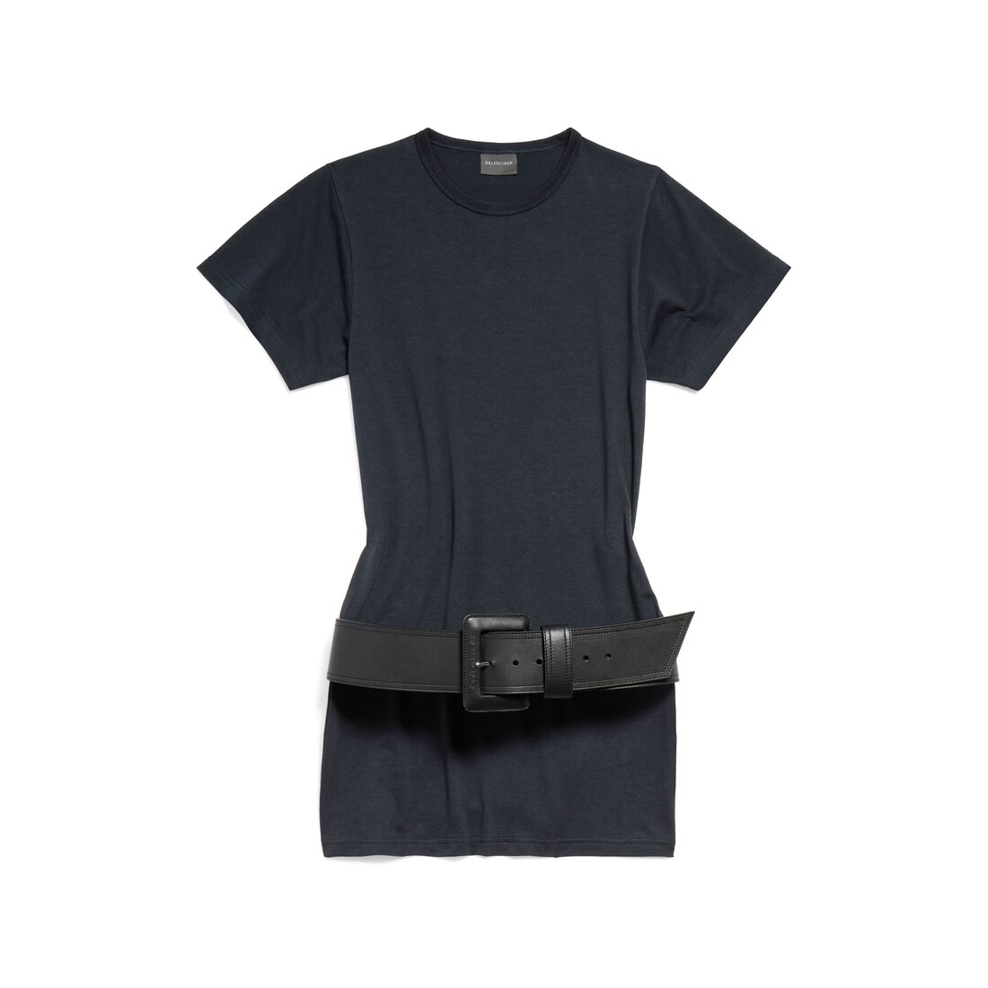 Fitted T-Shirt Dress in faded black peeling stretch jersey PRODUCT DETAILS • Peeling stretch jersey • Crewneck • Short sleeves • Sewned lambskin belt • Made in Portugal Main material: 95% cotton, 5% elastane