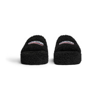 Furry Platform Sandal in black fake shearling, white and red political campaign embroideries PRODUCT DETAILS • Fake shearling • Sandal • 50mm platform height • Embroidered political campaign artwork on the upper • Tone-on-tone sole • Black outsole • Made in Italy • Wipe with a soft cloth Material: 100% polyester