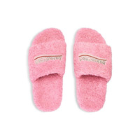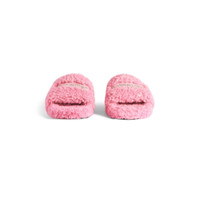 Furry Slide Sandal in sweet pink synthetic material, white and red political campaign artwork embroideries with rhinestones PRODUCT DETAILS • Polyester • Slide sandal • Embroidered Balenciaga political campaign artwork with rhinestones • Tone-on-tone sole • Black outsole • Made in Italy Upper: polyester - Sole: TPU - Insole: polyester