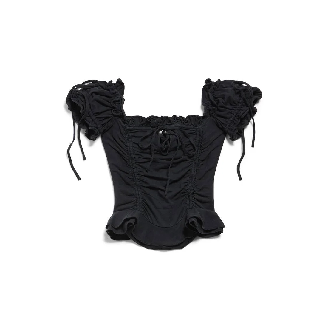 Gathered Cropped Top in faded black dry jersey PRODUCT DETAILS • Dry jersey • Short sleeves • Ruffles at neckline, sleeves and bottom • Thin strings tied details on front and sleeves • Gathered effect • Slightly open back • Made in Portugal Main material: 100% cotton