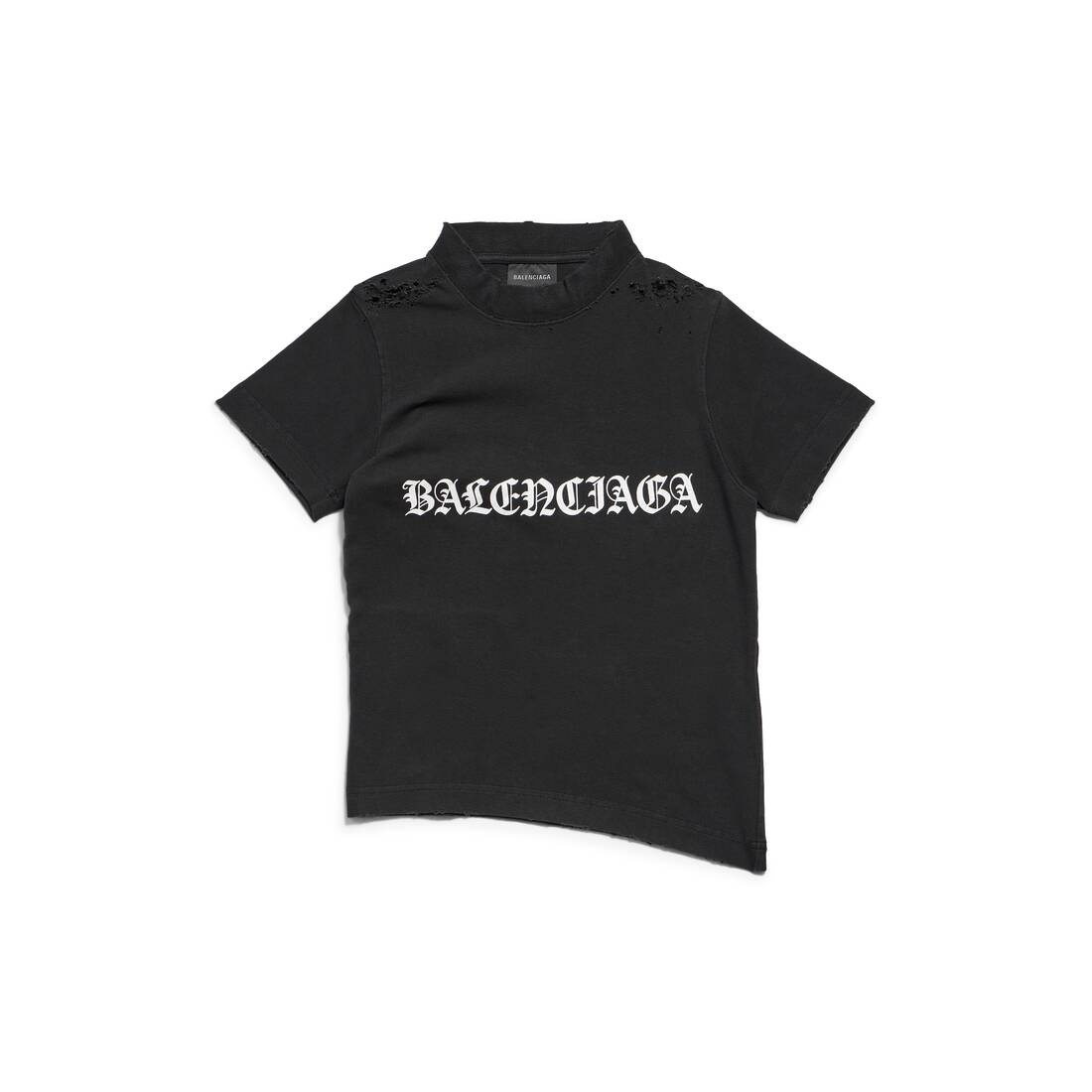 Gothic Type Shrunk T-Shirt Bodycon Fit in black and white antique peeling stretch jersey PRODUCT DETAILS • Antique peeling stretch jersey • Crewneck • Short sleeves • Cropped length • Gothic type logo printed at front • Cracked effect artwork • Destroyed and dirty effect • Made in Portugal Material: 94% cotton, 6% elastane