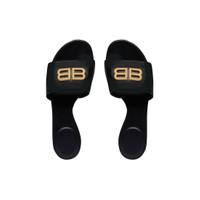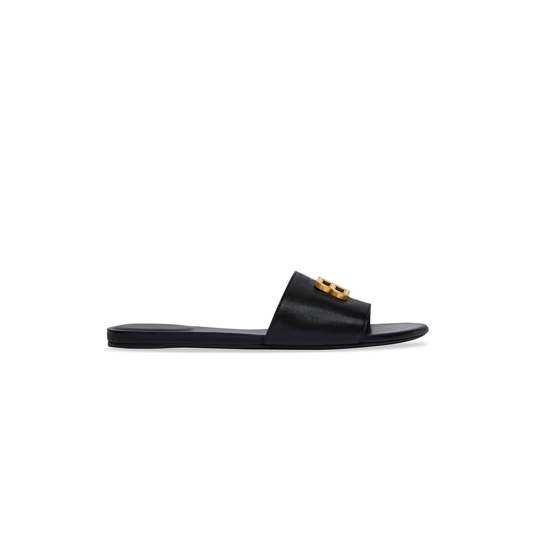 Groupi Sandal in black shiny soft sheepskin PRODUCT DETAILS • Shiny soft sheepskin • Flat sandal • Open toe • 5mm arch • Gold BB logo on the upper • Tone-on-tone insole • Made in Italy • Wipe with a soft cloth Material: 100% sheepskin