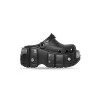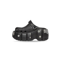 HardCrocs™ Sandal in black rubber PRODUCT DETAILS • Rubber • Sandal • Round toe • 10mm arch • 110mm platform • Balenciaga logo debossed on strap • Balenciaga logo debossed on silver metal piece effect at front and back • BB logo engraved on studs • Tone-on-tone sole and insole • Made in China • Crocs™ collaboration • Wipe with a soft cloth Material: 100% TPU