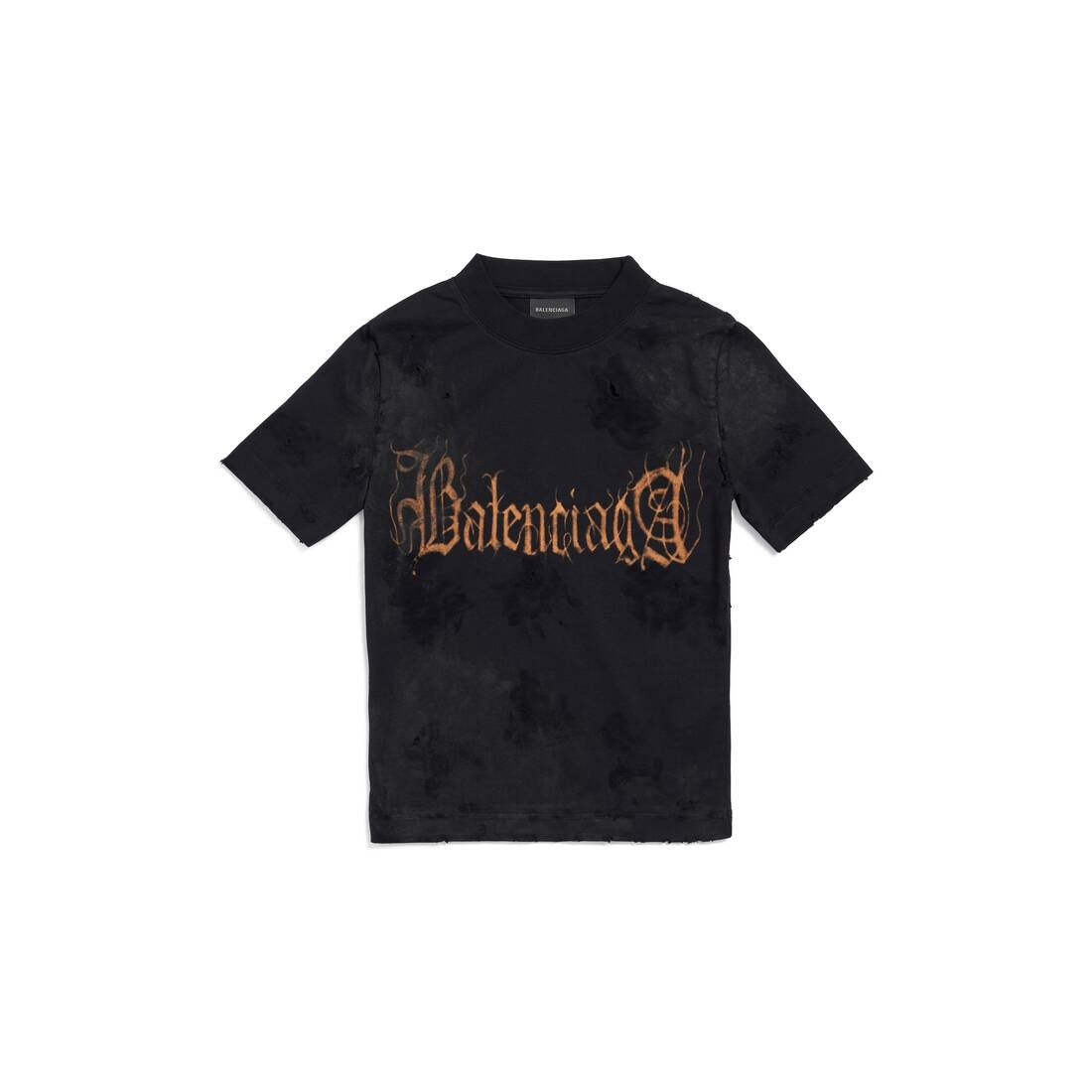 Heavy Metal Tight T-Shirt Small Fit in black vintage jersey PRODUCT DETAILS • Vintage jersey • Small fit • Crewneck • Short sleeves • Heavy metal artwork bleached out at front and back • Worn-out and dirty effect • Made in Portugal • Dry cleaning • The model is wearing a size S Material: 100% cotton