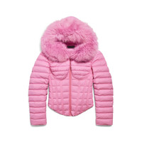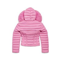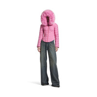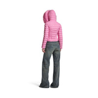 Hooded Corseted Puffer in pink matte synthetic material for Women is from look 36 of Balenciaga Winter 25 Collection. PRODUCT DETAILS • Lightweight matte polyamide • Hood with polyester faux-fur detail • Reinforced, corseted front • Quilted construction • Rounded bottom • Double-ended zip fastening • Made in Italy Main material: 100% polyamide