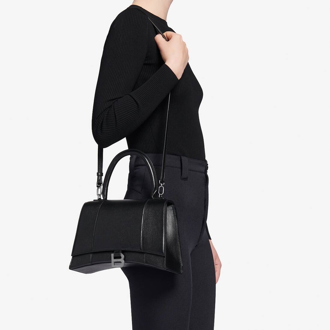 Hourglass Handbag in black grained calfskin PRODUCT DETAILS • Dimensions : L10,6 x H7,8 x W3,9 inch • Grained calfskin • Handbag shape sits between Medium and Small formats • Hourglass shape • Curvilinear base • Adjustable and removable leather strap (21,6 inch) • One handle • Magnet closure with black B hardware (brass) • 1 back pocket • 1 inner zipped pocket • 2 inner patch pockets • Nappa lambskin lining • Made in Italy • Wipe with a soft cloth Material: 100% calfskin