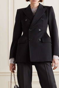 EDITORS'NOTES This 'Hourglass' jacket is inspired by the 'Basque' waistcoats that were originally designed by founder, Cristóbal Balenciaga in the '50s. It's tailored from wool in a beautifully architectural silhouette that flutes at the waist. Style yours with tailored separates and metallic accessories. SIZE & FIT - Fits true to size, take your normal size - Tailored for a slightly loose fit - Internal shoulder pads - Mid-weight, non-stretchy fabric - Model is 180cm/ 5’11” and is wearing a FR 36 DETAILS & CARE - Black wool - Button fastenings through double-breasted front - 100% wool; lining: 100% cupro - Dry clean