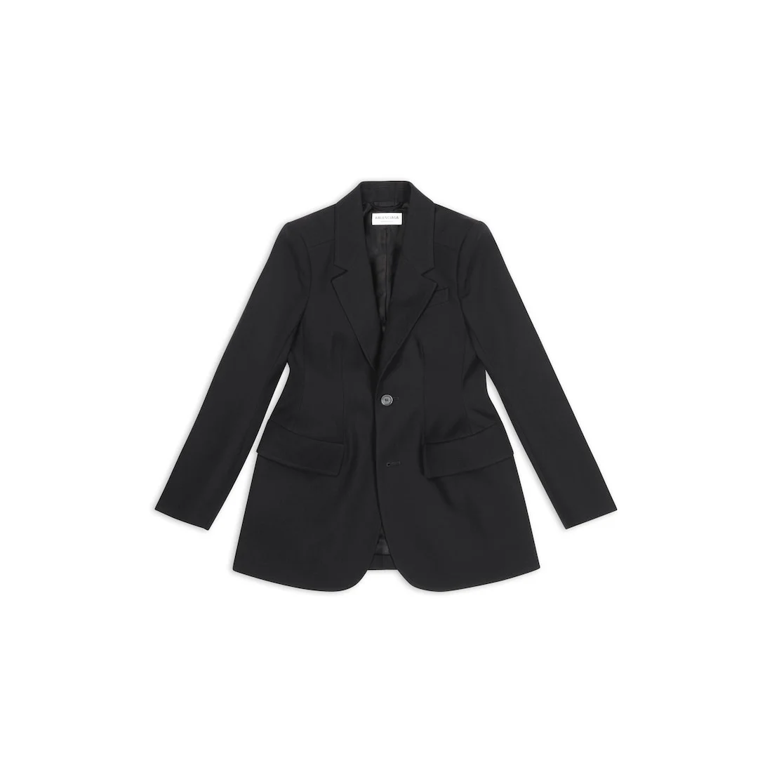 Hourglass Jacket in black wool twill PRODUCT DETAILS • Twill • Darts • Basic solid colour • Lapel collar • 2 buttons single-breasted at front • Two pockets • Long sleeves • Buttoned cuffs • Single chest pocket • Button closing • Fully lined • Front closure Material: 100% Virgin Wool
