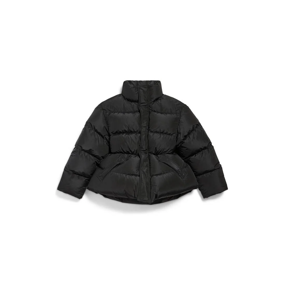 Hourglass Puffer in black matte synthetic material is from look 29 of Balenciaga's Spring 26 Collection. PRODUCT DETAILS • Mini ripstop polyamide • Hourglass shape • High stand up collar • Concealed zipped closure with snap placket • 2 slash pockets • Rounded bottom • Made in Italy Main material: 100% polyamide