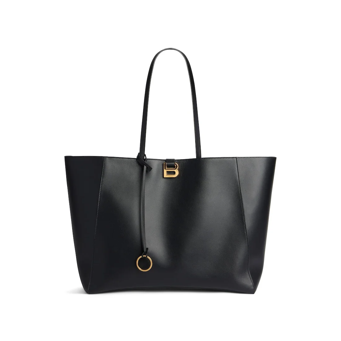 Hourglass Soft Large Tote Bag in black smooth calfskin, shiny gold hardware PRODUCT DETAILS • Dimensions: L20,1 x H12,6 x W7,1 inch • Smooth calfskin • Tote bag • Curvilinear base • Two handles (drop: 9,8 inch) • Shoulder and hand carry • Removable key holder with one spilt ring logo engraved • Shiny gold B logo hardware • Snapped closure • 1 main compartment • 1 inner zipped pocket • Suede-like fabric lining • Made in Italy Material: calfskin