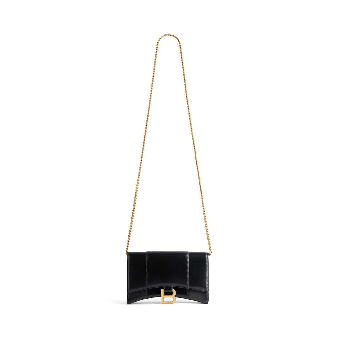 Hourglass Wallet On Chain in black shyni box calfskin, aged-gold hardware PRODUCT DETAILS • Dimensions : L7,6 x H4,7 x W1,9 inch • Shiny box calfskin • Curvilinear shape • Wallet on chain • Adjustable chain strap (52 cm) • Studded magnet closure • B logo aged-gold hardware • 1 patch pocket • 1 inner zipped pocket • 6 inner card slots • Nappa lambskin lining • Made in Italy • Wipe with a soft cloth Material: 100% calfskin