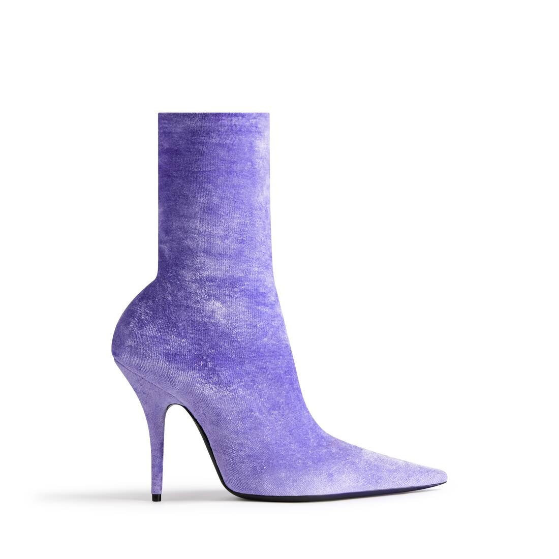 Knife 110mm Bootie in light purple fluid velvet jersey PRODUCT DETAILS • Fluid velvet jersey • Bootie • Elongated pointed toe • 110mm arch • Tone-on-tone covered heel • Black outsole • Made in Italy • Wipe with a soft cloth Material: 79% viscose, 19% polyamide, 2% elastane