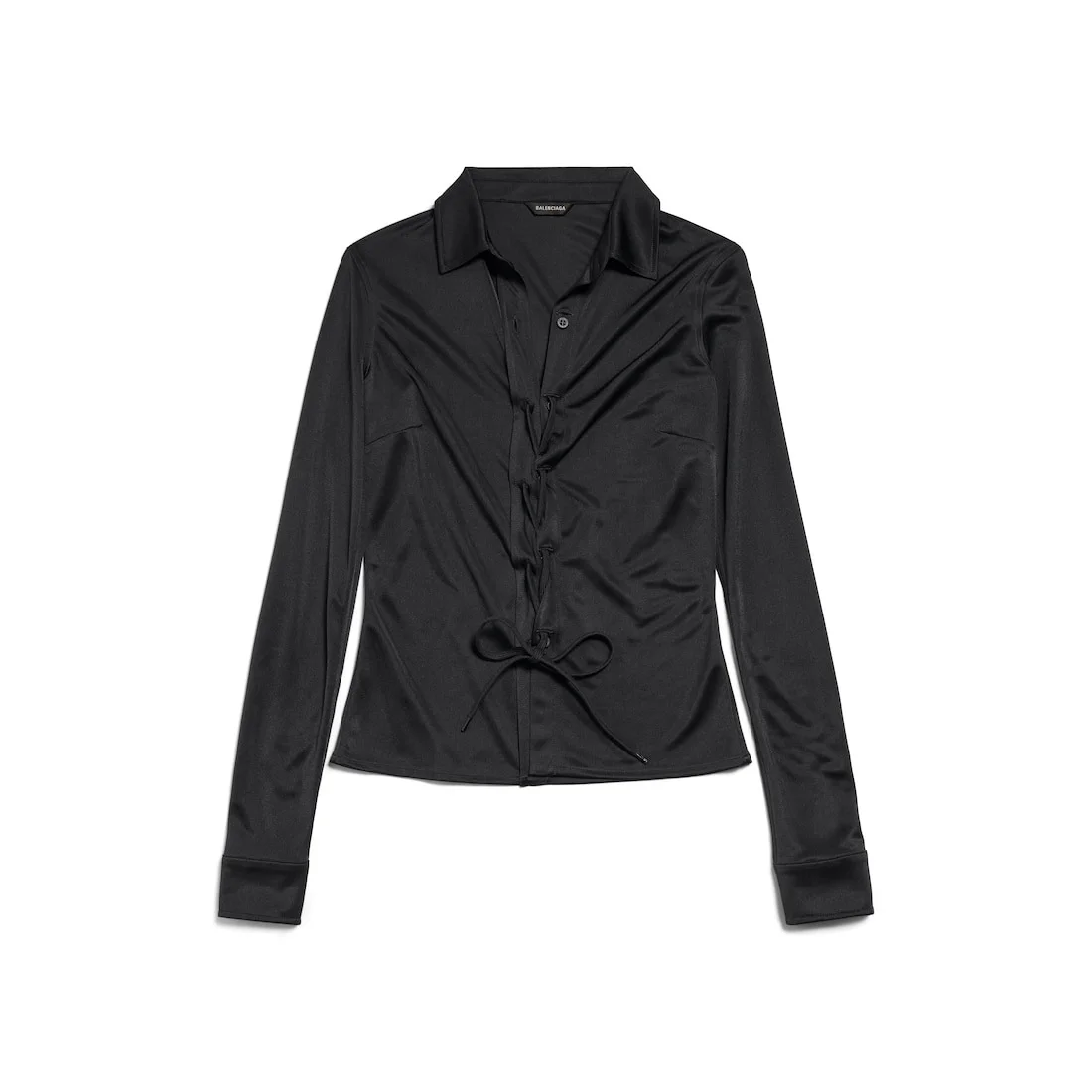 Lace-Up Shirt in black polyester jersey for Women PRODUCT DETAILS • Polyester jersey • Shirt collar • 6 front buttons • Laced front • Long sleeves • Buttoned cuffs • Balenciaga engraved buttons • Made in Italy Main material: 100% polyester