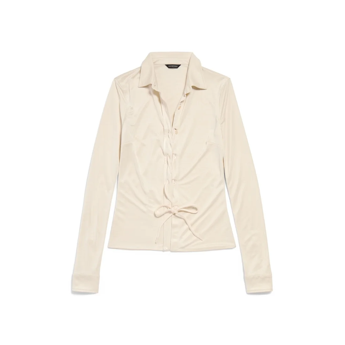 Lace-Up Shirt in champagne beige polyester jersey for Women PRODUCT DETAILS • Polyester jersey • Shirt collar • 6 front buttons • Laced front • Long sleeves • Buttoned cuffs • Balenciaga engraved buttons • Made in Italy Main material: 100% polyester