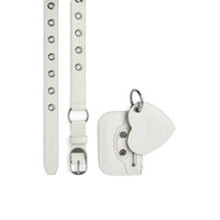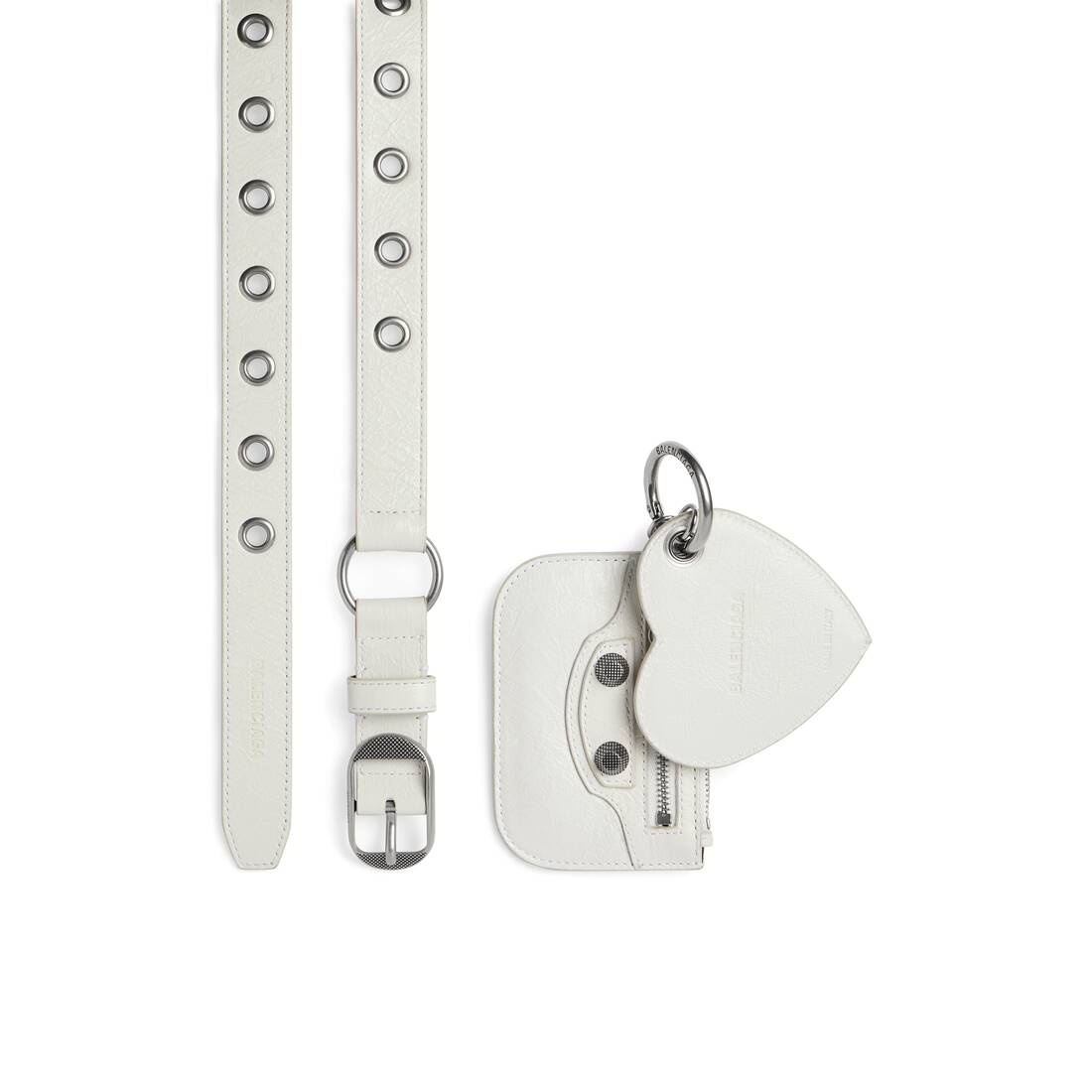 Le Cagole Charms Belt in white Arena calfskin, aged-silver hardware PRODUCT DETAILS • Dimensions: Width: 0,9 inch • Arena calfskin • Tone-on-tone Balenciaga logo embossed • Aged-silver hardware • 1 slip ring with Balenciaga logo engraved • 1 removable zipped pouch • 1 removable heart mirror • Tone-on-tone leather loop • Made in Italy • Wipe with a soft cloth Material: 100% calfskin