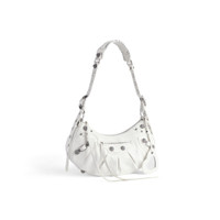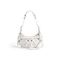 Le Cagole Small Shoulder Bag in white Arena lambskin, aged-silver hardware PRODUCT DETAILS • Dimensions: L13 x H6,3 x W3,3 inch • Arena lambskin • Shoulder bag • Adjustable shoulder strap (19,3 inch) • Leather braided shoulder pad • Zipped closure with knotted leather puller • Front zipped pocket with knotted leather puller • Aged-silver hardware • 1 removable zipped pouch • 1 removable heart mirror • Tone-on-tone Balenciaga logo embossed on mirror • 1 zipped back pocket with knotted leather puller • 1 inner zipped pocket • Cotton canvas lining • Made in Italy • Wipe with a soft cloth Material: 100% calfskin