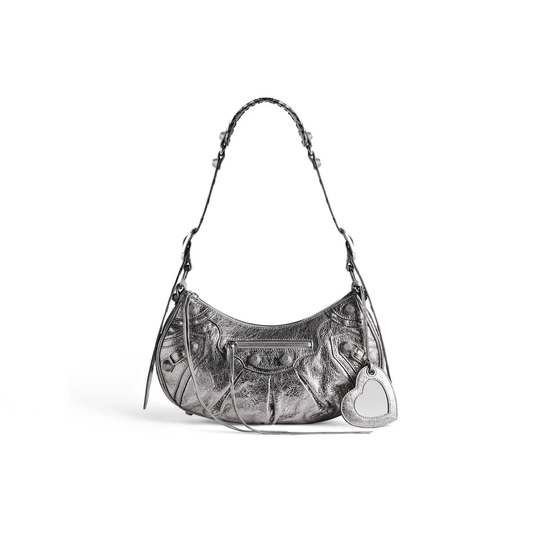 Le Cagole Small Shoulder Bag in silver metallized Arena lambskin, aged-silver hardware PRODUCT DETAILS • Dimensions: L13 x H6,3 x W3,3 inch • Metallized Arena lambskin • Shoulder bag • Adjustable shoulder strap (19,3 inch) • Leather braided shoulder pad • Zipped closure with knotted leather puller • Front zipped pocket with knotted leather puller • Aged-silver hardware • 1 removable zipped pouch • 1 removable heart mirror • Tone-on-tone Balenciaga logo embossed on mirror • 1 zipped back pocket with knotted leather puller • 1 inner zipped pocket • Cotton canvas lining • Made in Italy • Wipe with a soft cloth Material: 100% lambskin