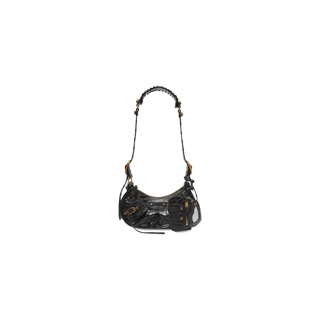 Le Cagole XS Shoulder Bag in black extra supple crocodile embossed calfskin, aged-gold hardware PRODUCT DETAILS • Dimensions : L10,2 x H6,3 x W2,7 inch • Extra supple crocodile embossed calfskin • Shoulder bag • Adjustable shoulder strap (18,1 inch) • Leather braided shoulder pad • Zipped closure with knotted leather puller • Aged-gold hardware • 1 removable zipped pouch • 1 removable heart mirror • Tone-on-tone Balenciaga logo embossed on the mirror • Cotton canvas lining • Made in Italy • Wipe with a soft cloth Material: 100% calfskin