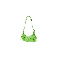Le Cagole XS Shoulder Bag in bright green extra supple crocodile embossed calfskin, aged-silver hardware PRODUCT DETAILS • Dimensions : L10,2 x H6,3 x W2,7 inch • Extra supple crocodile embossed calfskin • Shoulder bag • Adjustable shoulder strap (18,1 inch) • Leather braided shoulder pad • Zipped closure with knotted leather puller • Aged-silver hardware • 1 removable zipped pouch • 1 removable heart mirror • Tone-on-tone Balenciaga logo embossed on mirror • Cotton canvas lining • Made in Italy • Wipe with a soft cloth Material: 100% calfskin
