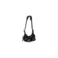 Le Cagole XS Shoulder Bag in black extra supple crocodile embossed calfskin, aged silver hardware with rhinestones PRODUCT DETAILS • Dimensions : L10,2 x H6,3 x W2,7 inch • Extra supple crocodile embossed calfskin • Shoulder bag • Adjustable shoulder strap (18,1 inch) • Leather braided shoulder pad • Zipped closure with knotted leather puller • Aged silver hardware with rhinestones • 1 removable zipped pouch • 1 removable heart mirror • Tone-on-tone Balenciaga logo embossed on mirror • Cotton canvas lining • Made in Italy • Wipe with a soft cloth Material: 100% calfskin