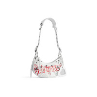 Le Cagole XS Shoulder Bag in white DIY metal artwork printed Arena lambskin, aged-silver hardware PRODUCT DETAILS • Dimensions: L10,2 x H6,3 x W2,7 inch • DIY metal artwork printed Arena lambskin • Shoulder bag • Adjustable shoulder strap (18,1 inch) • Leather braided shoulder pad • Zipped closure with knotted leather puller • Aged-silver hardware • 1 removable heart mirror • Tone-on-tone Balenciaga logo debossed on mirror • Cotton canvas lining • Made in Italy • Wipe with a soft cloth Material: 100% lambskin
