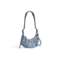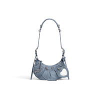 Le Cagole XS Shoulder Bag in blue washed and frayed denim, aged-silver hardware PRODUCT DETAILS • Dimensions : L10,2 x H6,3 x W2,7 inch • Washed and frayed denim • Shoulder bag • Adjustable shoulder strap (18,1 inch) • Denim braided shoulder pad • Zipped closure with knotted denim puller • Aged-silver hardware • 1 removable zipped pouch • 1 removable heart mirror • Balenciaga logo printed on the mirror • Cotton canvas lining • Made in Italy • Wipe with a soft cloth Material: 100% cotton