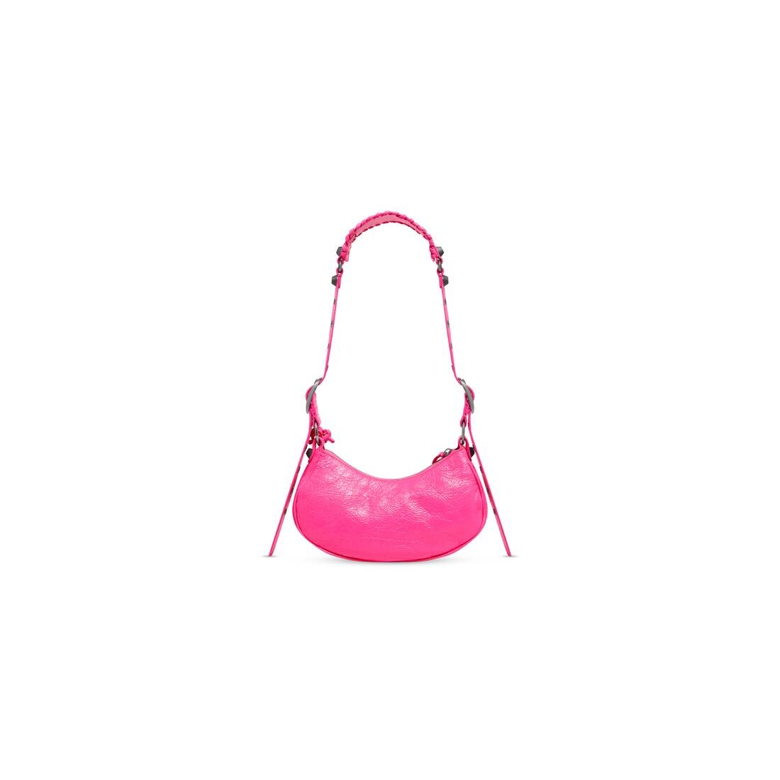 Le Cagole XS Shoulder Bag in neon pink Arena lambskin, aged-silver hardware PRODUCT DETAILS • Dimensions: L10,2 x H6,3 x W2,7 inch • Arena lambskin • Shoulder bag • Adjustable shoulder strap (18,1 inch) • Braided shoulder pad • Zipped closure with knotted leather puller • Aged-silver hardware • 1 removable zipped pouch • 1 removable heart mirror • Tone-on-tone Balenciaga logo embossed on mirror • Cotton canvas lining • Made in Italy • Wipe with a soft cloth Material: 100% lambskin