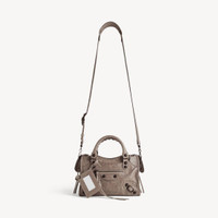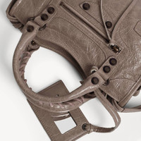 Le City Bag Mini in dark noix Arena lambskin, brass hardware PRODUCT DETAILS • Arena lambskin • Two hand-braided handles with waxed cord • Removable and adjustable strap with shoulder pad • Brass hardware • Double-sided zip with long tails and knotted leather puller • Front zipped pocket with knotted leather puller • 1 inner zipped pocket • 1 removable mirror • Tone-on-tone Balenciaga logo debossed on mirror • Cotton canvas lining • Made in Italy Material: lambskin, cotton, plexiglass