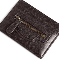 Le City Card Holder in espresso Arena Storico lambskin PRODUCT DETAILS • Dimensions: L3,9 x H3,1 x W0,2 inch • Arena Storico lambskin • Card holder • Balenciaga logo debossed tone-on-tone at back • Brass hardware • Front zipped pocket • 4 card slots • 1 bill pocket • Made in Italy Material: lambskin