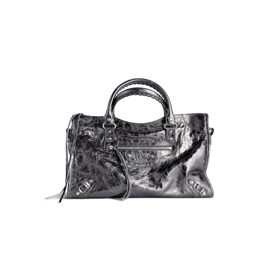 Le City Medium Bag in grey metallized Arena lambskin, shiny silver hardware PRODUCT DETAILS • Dimensions: L14,6 x H9,2 x W5,9 inch • Metallized Arena lambskin • Two leather hand-braided handles • Removable shoulder strap (drop: 13,4 inch) • Shiny silver hardware • Zipped closure with knotted leather puller • Front zipped pocket with knotted leather puller • 1 inner zipped pocket • Cotton canvas lining • Made in Italy • This item is not available for pick up in store. In case you choose pick up in store, our client services will contact you. Material: lambskin