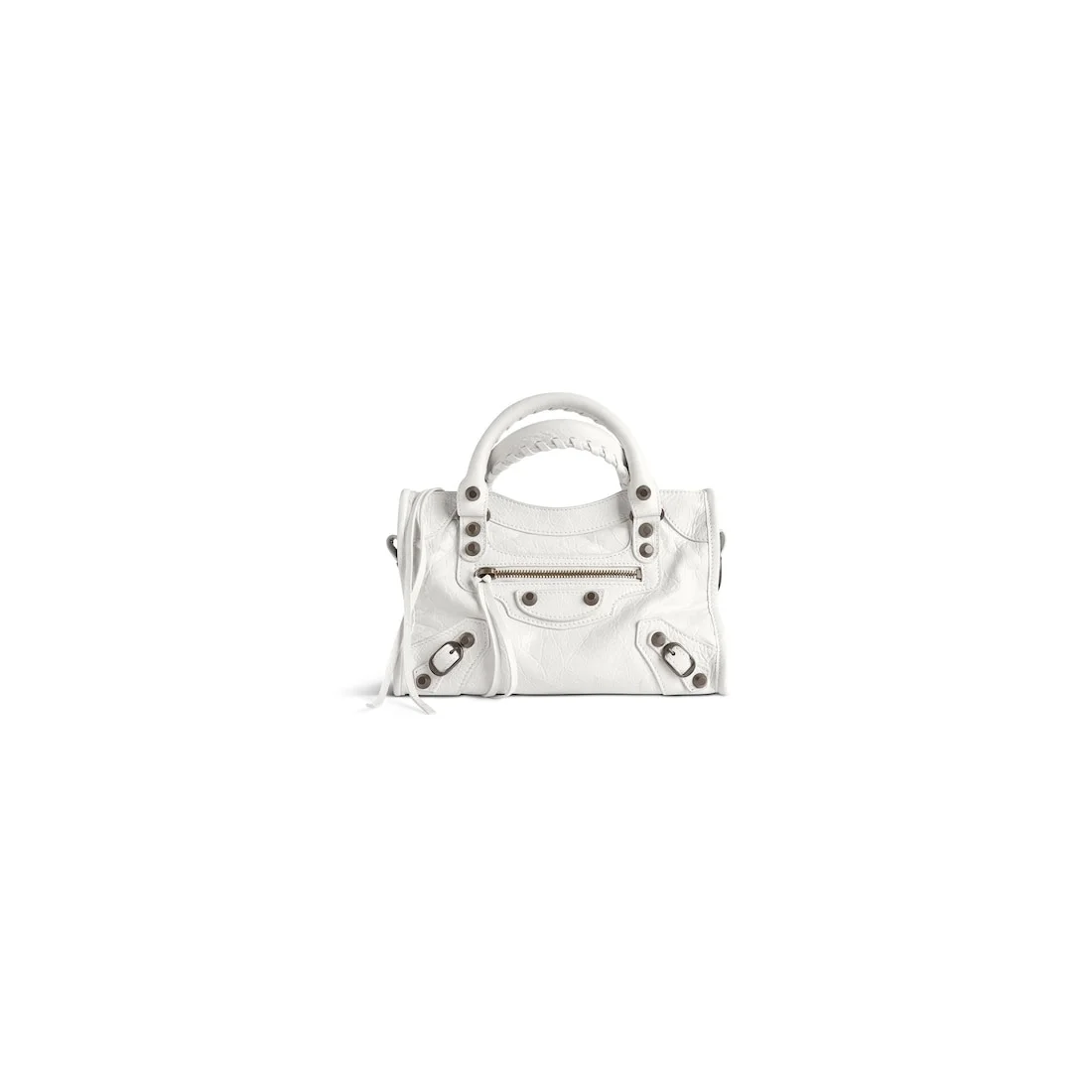 Le City Mini Bag in white Arena Storico lambskin, brass hardware PRODUCT DETAILS • Dimensions: L9,4 x H6,3 x W2,5 inch • Arena Storico lambskin • Two leather hand-braided handles • Removable shoulder strap (drop: 17,7 inch) • Brass hardware • Zipped closure with knotted leather puller • Front zipped pocket with knotted leather puller • 1 inner zipped pocket • Cotton canvas lining • Made in Italy Material: lambskin