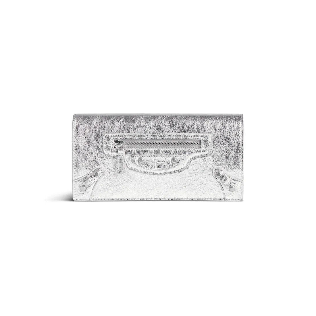 Le City Money Long Wallet in silver metallized Arena lambskin PRODUCT DETAILS • Dimensions: L7,4 x H3,9 x W0,7 inch • Metallized Arena lambskin • Long Wallet • Balenciaga logo debossed tone-on-tone at back • Shiny silver hardware • Snapped flap closure • 1 inner zipped coin pouch • 1 inner bill pocket • 12 card slots • Made in Italy Material: lambskin