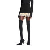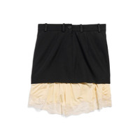 Lingerie Mini Tailored Skirt in blackbarathea wool and beige lace PRODUCT DETAILS • Barathea wool and lace • Tailoring waistline • 5 belt loops • Buttoned and zipped back • Left front slit on lingerie part • Cupro lining • Mini length • Made in Italy Main material 1: 100% wool