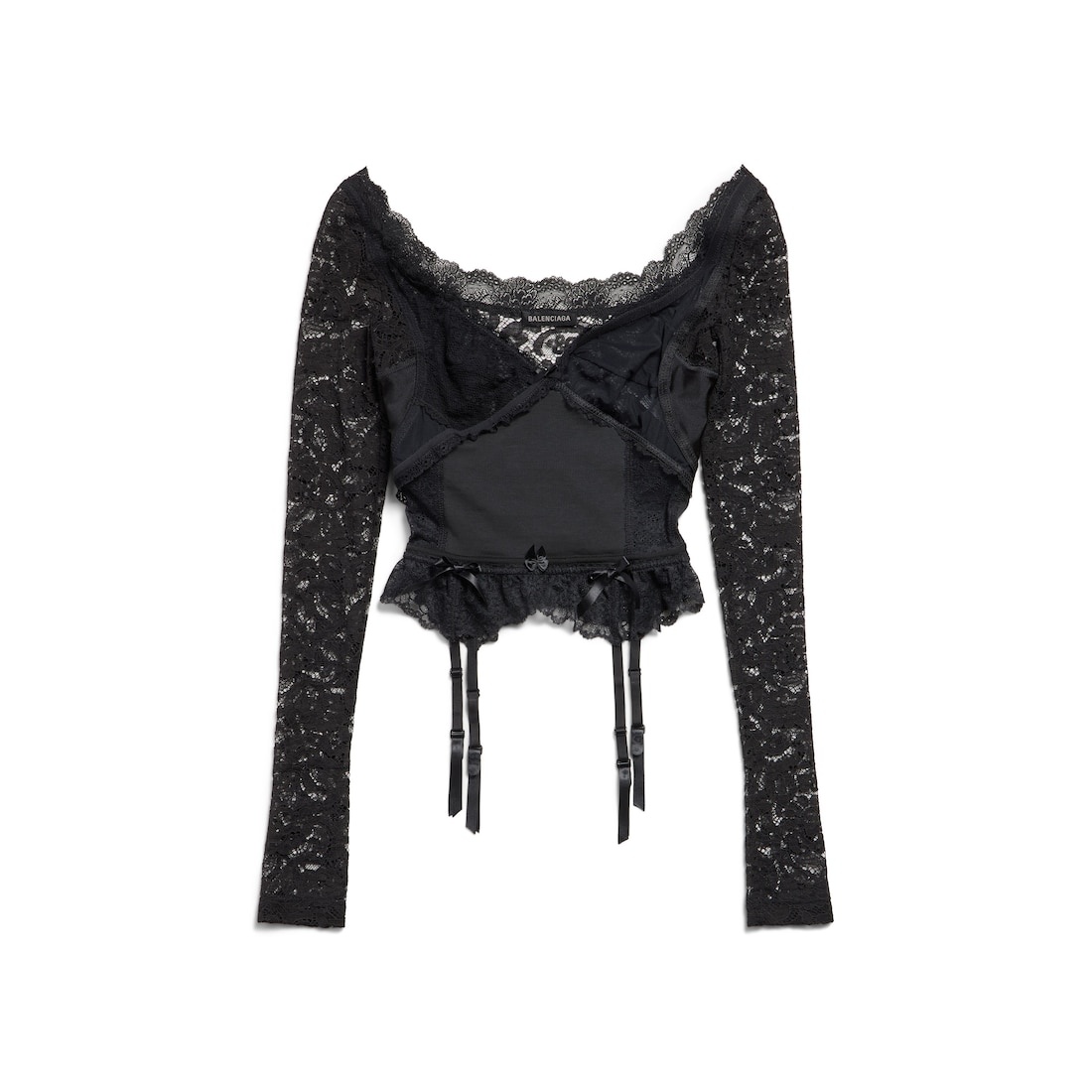 Lingerie Top in black stretch plumetis lace PRODUCT DETAILS • Mixed fabric: laces and stretch polyamide • Lingerie details • Long sleeves • Made in Italy Main material: 78% polyamide, 22% elastane