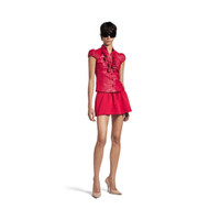 Lion Football Shorts Mini Skirt in red dry fleece is from look 33 of Balenciaga's Spring 26 Collection. PRODUCT DETAILS • Dry jersey • Mini skirt • Mid-waist • Football shorts inspired • Elasticated waistband with drawstring • 2 slash pockets • Tone-on-tone lion artwork embroidered on left hem • Made in Portugal Main material: 100% cotton