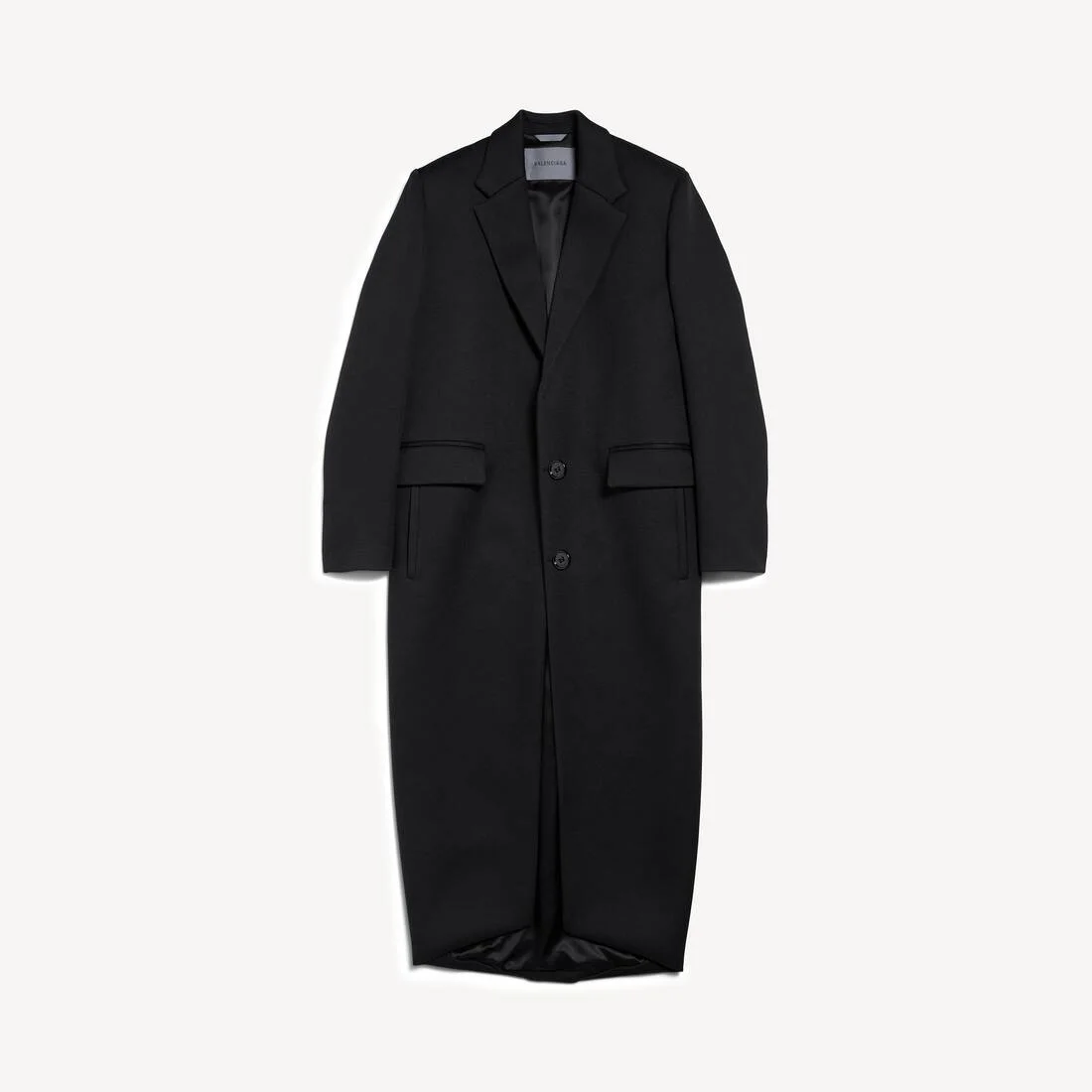 Long Sack Coat in black chunky wool gabardine is from look 12 of Balenciaga's Summer 26 Collection. PRODUCT DETAILS • Chunky wool gabardine • Fully lined • Sack shape, an homage to Cristobal Balenciaga • Elongated vertical construction • Large rounded back • Shoulder pads • Peak lapel • Undefined waistline • 2 front flap pockets • 2 front piped pockets • Made in Italy Main material: 100% wool